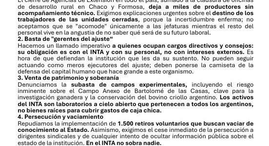 La seccional El Colorado de la Asociación de Personal del INTA manifestó su ‘enérgico rechazo’ ante lo que considera un plan de destrucción sistemática de la institución. Los gremialistas denuncian el cierre de agencias de extensión, la venta de campos experimentales y la implementación de 1.500 retiros voluntarios.