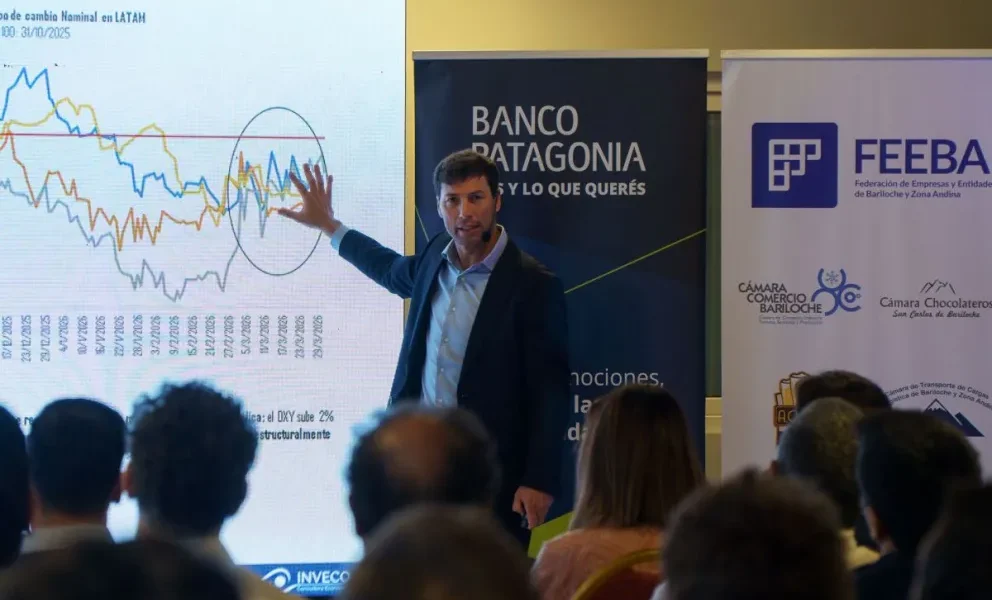 Tras la presentación de las herramientas financieras disponibles, desarrollada en conjunto con el gobierno provincial, Domecq inició su exposición sobre la coyuntura económica, centrándose en la actualidad internacional y sus posibles efectos sobre Argentina y la región patagónica.